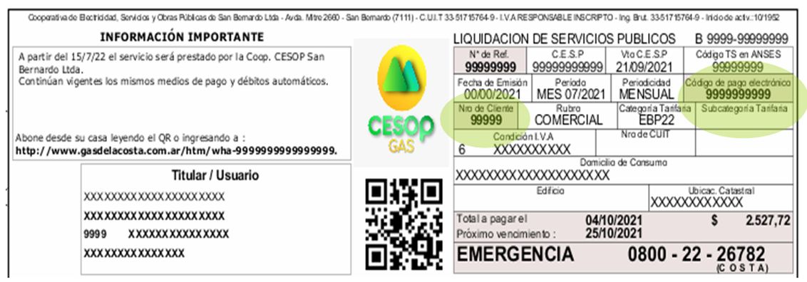 Información Usuario: debe ingresar el "Número de cliente" informado en su factura. Ver modelo debajo. Clave: debe ingresar el "Código de pago electrónico" informado en su factura, incluyendo los ceros que tenga a la izquierda. Ver modelo debajo.